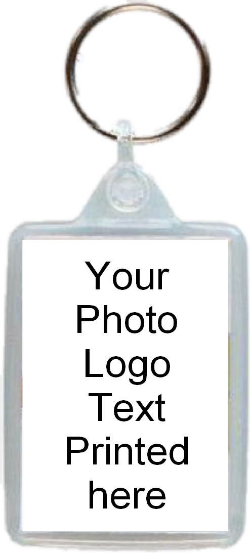 Acrylic keyring with metal ring.50mm x 35mm print size. Encased print both sides. Printed with your photo, logo, text