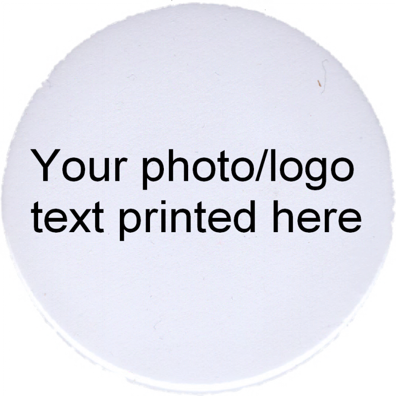 59mm diameter. Made with metal, print, mylar and mirror. Printed with your photo, logo, text.